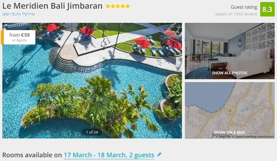 At the moment, you can book and stay at top-rated 5* Meridien Bali Jimbaran for very cheap rates. Get the luxury treatment with the rates starting from only €59 per night/room.