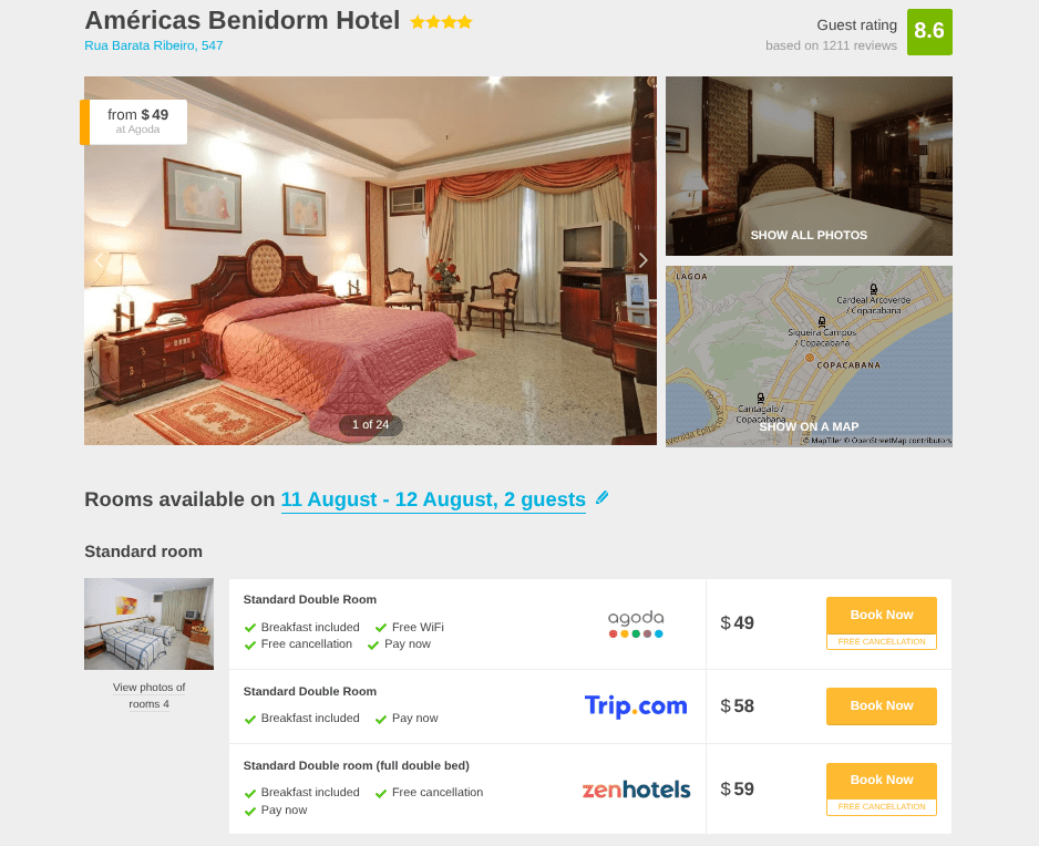 If you book now, you can get special prices for your stay at the top-rated 4* Amรฉricas Benidorm Hotel in Rio de Janeiro. The rates are now available starting from only $ 49 per night/room (including breakfast for two, also free cancellation).
